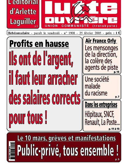 Les bénéfices des grandes entreprises ont atteint, l'an passé, des montants records. Dans les banques, ils ont augmenté en moyenne de 25%. Dans l'automobile, Renault a augmenté les siens de 43%. Madame Bettencourt, première fortune de France, a de quoi se réjouir des 143% d'augmentation des bénéfices de la société L'Oréal, dont elle est la principale actionnaire. Arcelor, devenu le géant de l'acier par la fusion d'entreprises qui avaient mis à la porte des milliers d'ouvriers de la sidérurgie, a multiplié ses bénéfices par 9. La palme revient à Total. Cette entreprise pollueuse des côtes bretonnes et vendéennes, responsable de l'explosion de l'usine AZF à Toulouse, a encaissé 9 milliards d'euros, le plus important bénéfice jamais réalisé en France!